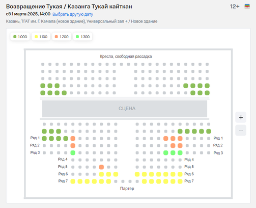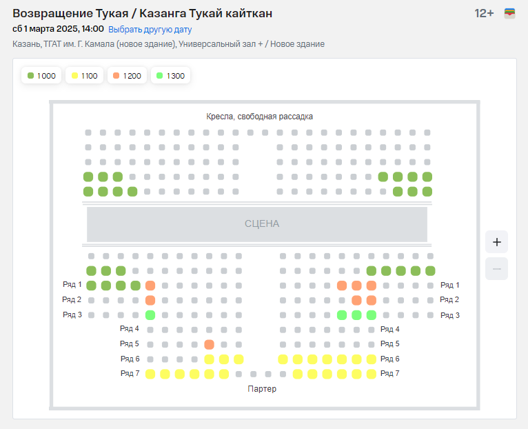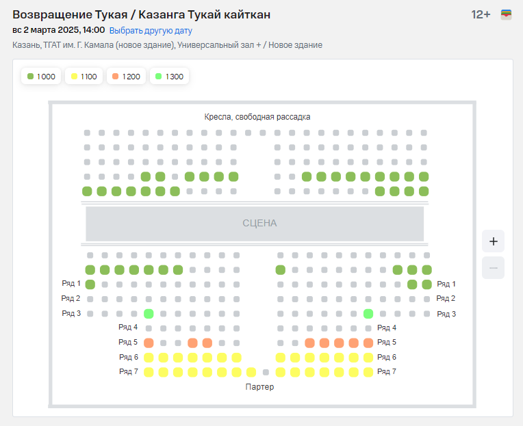 Билеты стоят от 1 000 до 1 300 рублей, их раскупают стремительно. Вот доказательства: схемы зала на оба дня горят серым — мест осталось мало.