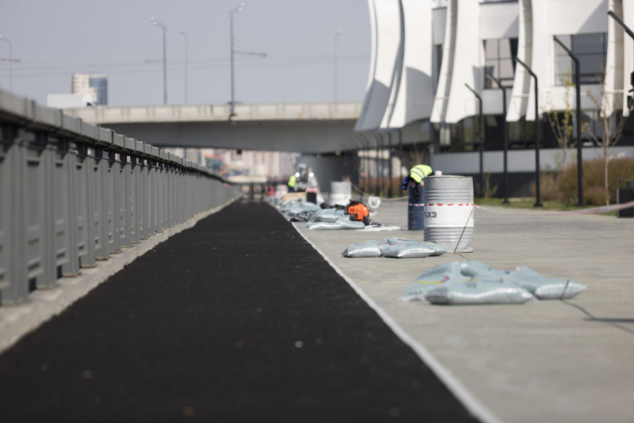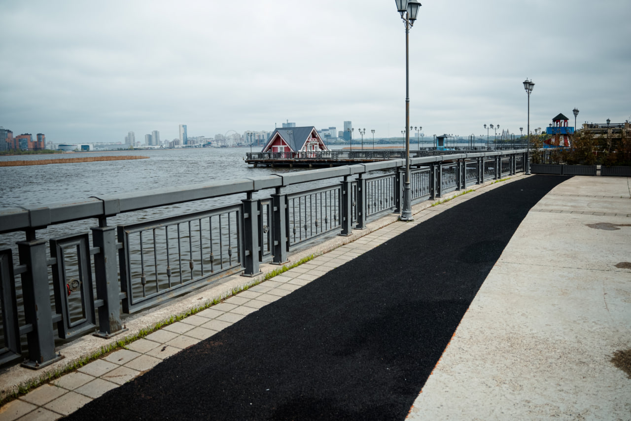 Ширина дорожки — 2 метра, а толщина покрытия — 8 мм. Стопы и колени бегунов скажут спасибо: резина точно приятнее голого бетона.