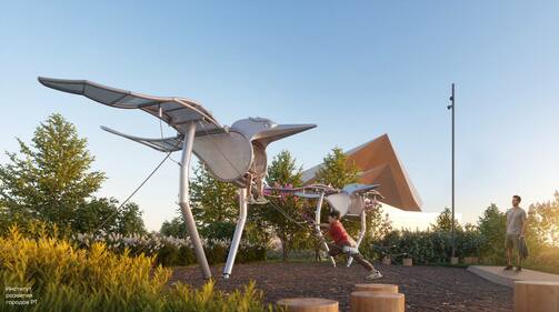 Цапли станут доминантой нового игрового пространства. Они видны издалека и притягивают внимание не только своими внушительными размерами, но и крыльями, которыми активно машут. Авторы «птичек» — бюро АФА и Richter Spielgeräte.