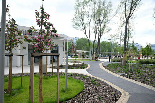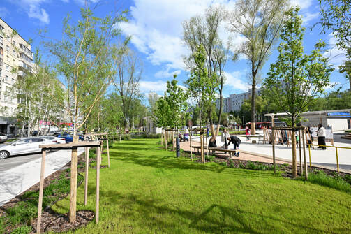 Бульвар отделили от дороги деревьями, кустарниками, многолетниками и зелеными холмами, а вместо стихийной стоянки с обеих сторон организовали парковочные места.