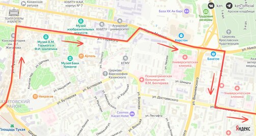 №71 — проезжает мимо остановок «Бутлерова», «Толстого», «Волкова», »Кинотеатр Мир», «Шмидта» и следует по маршруту от площади Тукая по улицам Пушкина, Горького, Карла Маркса и далее как обычно.
