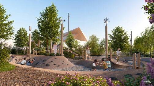 Детский парк возле нового театра Камала откроют в июне. Уже возведены бетонные конструкции, уложены дорожки, сформированы игровые рельефы и зеленые склоны. Установлены качели в виде серых цапель, смонтирована чаша игрового ручья, проведены инженерные коммуникации и высажены крупные деревья.