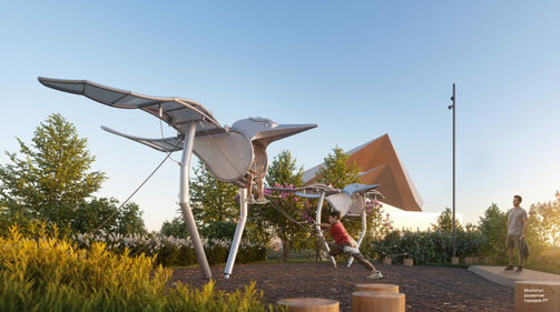 Доминантой нового игрового пространства станут цапли-орнитоптеры, которых уже можно увидеть на холме площадки. Они заметны издалека и притягивают внимание не только своими внушительными размерами, но и крыльями, которыми активно машут. Размах — 6,5 метра. Подобных динамических конструкций по всему миру насчитывается около 15 штук. Авторы казанских «птичек» — бюро АФА и Richter Spielgeräte.