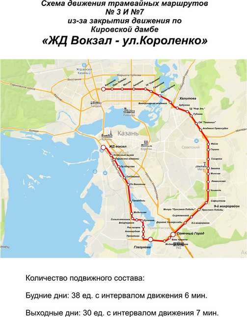 Маршрут №7 объединят с №3 и он будет ходить так: ж/д вокзал – Колхозный рынок – Тукая – Техническая – Глазунова – Солнечный город – проспект Победы – Арбузова – Ямашева, разворот на петле Короленко и далее в обратном направлении до ж/д. Количество транспорта на маршруте №7 увеличат.