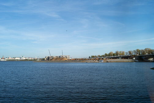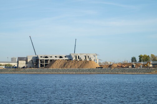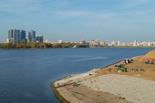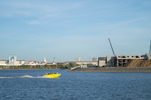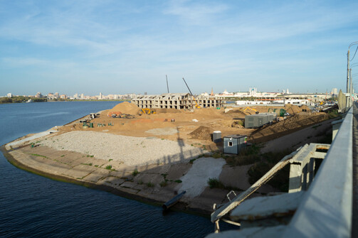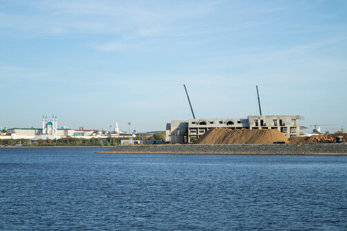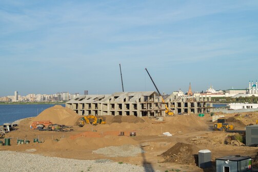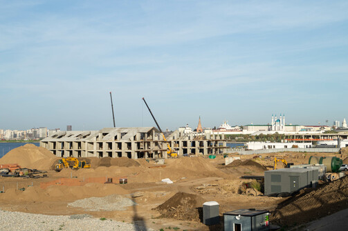 Судя по темпам строительства, звучит вполне реалистично. Уже видны очертания гостиницы, которую собирают как лего. На фото можно оценить ее размеры и размеры намывной территории: какой большой участок откусили от Казанки.