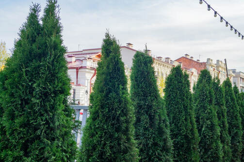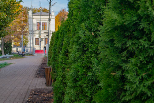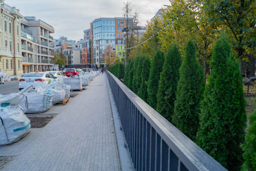 Вместо старых лип в Лядском вырос стройный ряд новодельных туй. Они как забор — скрывают гуляющих от бесконечного потока машин на Муштари.