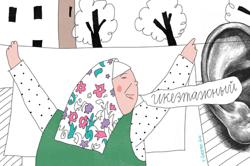 5. Две татарские тетушки болтают во дворе на Космонавтов, развешивая белье. Одна о чем-то рассказывает, активно перемешивая русский с татарским: