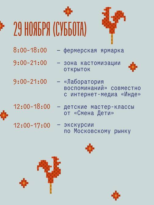 Экскурсии с дегустациями внутри рынка и на прилегающей территории проведет команда Московского рынка. Среди «экскурсоводов» — исполнительный директор рынка Тарлан Гусейнов, арт-директор Табрис Яруллин, арт-продюсер Лиля Валеева и PR-директор Юля Туранова. Регистрации на экскурсии откроются в телеграм-канале рынка 27 ноября.