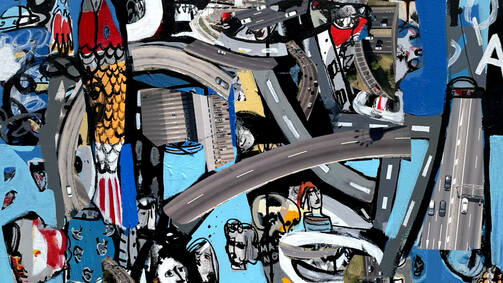 Бразильско-аргентинский художник Tec Fase превращает город в холст: гигантские рисунки на улицах и взлетно-посадочных полосах Сан-Паулу, дрон-интервенции и цифровые коллажи создают поэтические карты городской жизни.