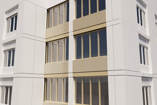Фасады домов №99, 101, 103 и 105 облицуют белыми алюминиевыми панелями, а дома №95 и 97 окрасят в этот же цвет. Козырьки, подшивку низа и рамы балконов выполнят из панелей золотого цвета. Для каждой квартиры предусмотрены корзины для кондиционеров.