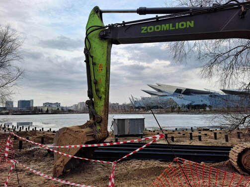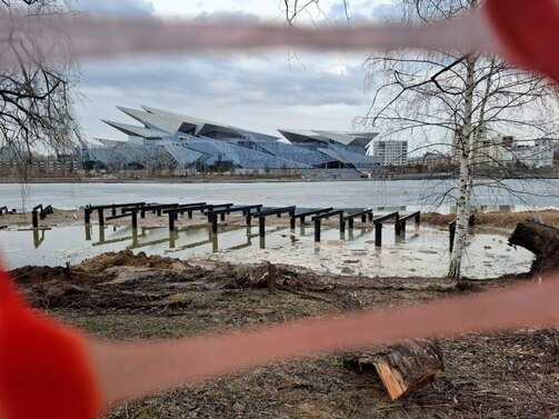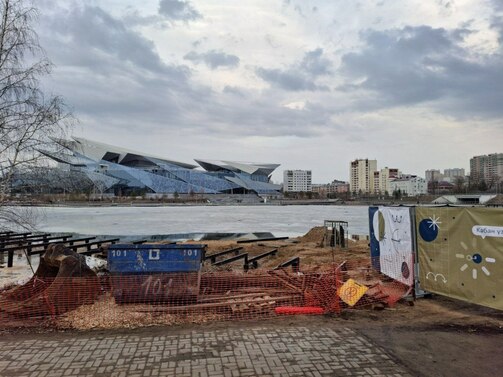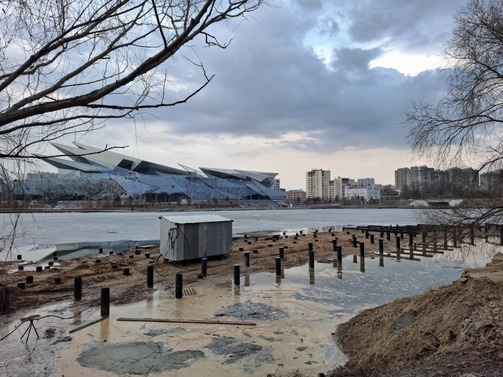 Променад у воды, спуски, смотровая площадка — все это появится в 2026 году на последнем непричесанном участке набережной Нижнего Кабана, от улицы Назарбаева до памятника Марджани. Строители вбили сваи, чуть-чуть поработали пилами и засыпали часть озера для будущего прогулочного пространства.