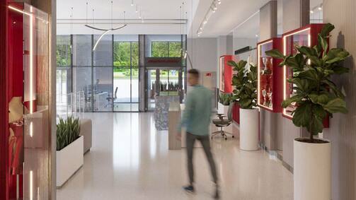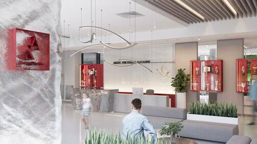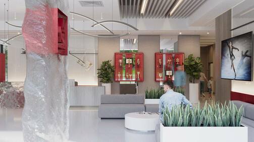 Основной цвет — жемчужно-серый, с красными акцентами. Это отсылка к олимпийской чемпионке Алине Загитовой, которая всегда эффектно выглядит в красном. В фойе выставят кубки, медали и ее концертные костюмы.