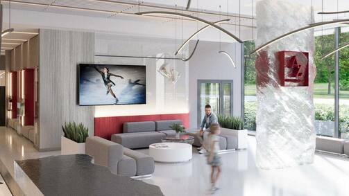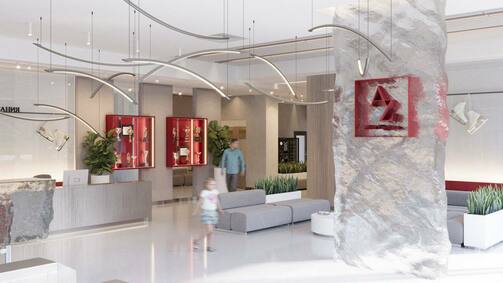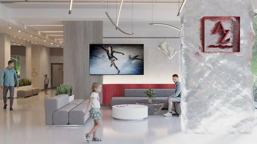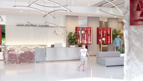 Светильники будут выполнены в форме следов от лезвий коньков, а центральным элементом холла станет колонна из акрила, имитирующая лед. Такое же решение будет принято для создания «ледяной» стойки ресепшена.