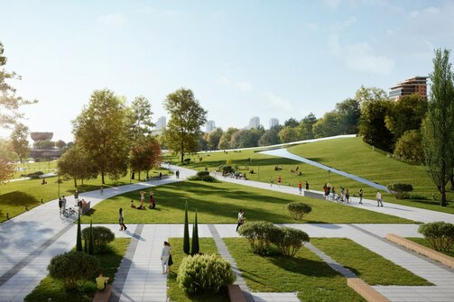 Также в проекте предусмотрено создание многоуровневого ландшафтного парка, который будет перетекать в Парк горизонтов, спроектированный французским архитектором Мишелем Пена. В северной части, вдоль Сибгата Хакима, появятся камерные маршруты через яблоневый сад, рукотворные холмы, декоративное озеро и прогулочная «сухая река», выложенная из камней и мха, с высаженными крупномерными соснами и хвойными кустарниками.