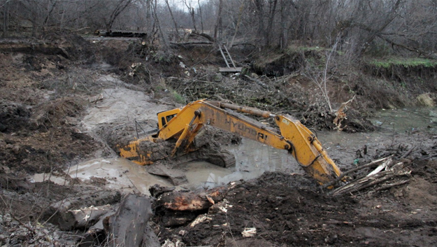 Так теперь выглядит район водопада на Большом Голубом озере - развороченная земля, вырубленные деревья и никакого водопада. На его месте лишь глубокая воронка во влажном грунте, из которой в минувшую пятницу выглядывал утонувший экскаватор, пишет «Вечерняя Казань».