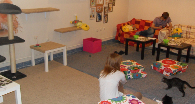 Навестить «Кота по соседству» можно с 11.30 до 21.30. Вход, естественно, платный. Для взрослых по будням 120 рублей за первый час, для детей 100 рублей за первый час. В выходные – 150 и 120 рублей соответственно. Для организованных групп, желающих посмотреть на кошек дружным коллективом из 8-15 человек, скидка. Цены на общение с природой не такие уж низкие. За комфорт и довольную кошку на коленях приходится платить.