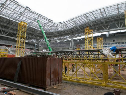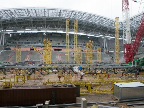 По завершении монтажа сцены здесь начнется установка оборудования, задействованного в церемонии открытия.