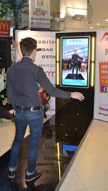 Виртуальная примерочная установлена рядом с центральным входом в молл. Она представляет собой невысокий помост и большой плазменный экран. Желающий воспользоваться услугами примерочной человек просто встает перед экраном. Специальное оборудование «считывает» размеры человека и его рост. После этого можно заняться примеркой. Управлять действиями виртуальной примерочной очень просто – не нужно подходить к экрану и что-то нажимать, достаточно просто водить рукой по воздуху – все движения опять же «считываются» и отображаются на экране. Сначала нужно выбрать интересующий магазин. После выбора магазина открывается список с 3D фотографиями моделей одежды. Стоит лишь «провести» рукой по понравившейся модели, как она тут же оказывается на вас – можно как следует рассмотреть себя в зеркале-экране и оценить, подходит ли фасон, к лицу ли цвет. Перед экраном виртуальной примерочной можно даже поворачиваться в разные стороны, чтобы как следует все рассмотреть - виртуальная одежда при этом не соскальзывает. Можно одновременно примерять несколько видов одежды, например, примерить виртуальную юбку и к ней подбирать различные блузки. Или интерактивно «надеть» брюки и уже к ним подобрать свитер или рубашки. В самом удачном наряде можно сфотографироваться. На экран выводится QR-код фотографии. Код можно распознать с помощью телефона и позднее посмотреть фото в интернете.