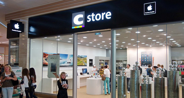 СStore открылся довольно скромно и незаметно – без девушек модельной внешности с «яблоками» на футболках и ведущего с шутками и прибаутками. Находится магазин справа от центрального входа в торговый центр. Все внутри, как и положено, корпоративного, стерильного белого цвета. Скрупулезность, присущая компании Apple, видна во всем – даже ноутбуки на полках открыты под определенным углом. Между тем, все устройства заряжены, работают – можно подходить, свободно тыкать не очень чистым пальцем в IPad, щупать товар, взвешивать в руке. Устройства подключены к интернету, так что проверять технику можно и на предмет скитания по сети. Ассортимент представлен хорошо, магазин полон продукции.
